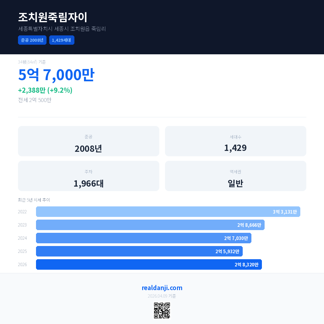 조치원죽림자이 국민평형 기준 2026년 평균 거래가는 2억 8,320만으로, 전년 대비 9.2% 상승 했습니다.