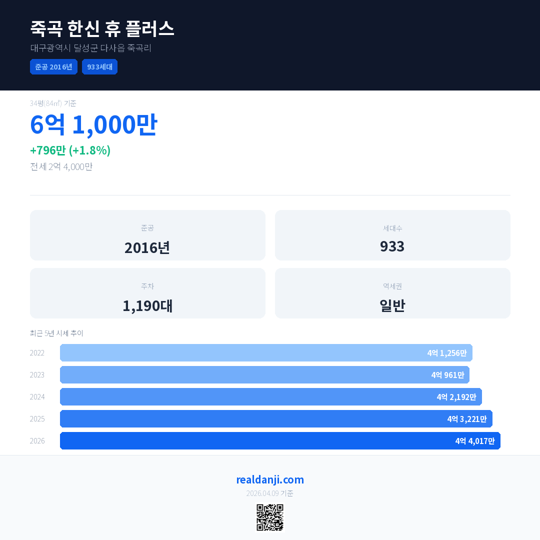 죽곡 한신 휴 플러스 국민평형 기준 2026년 평균 거래가는 4억 4,017만으로, 전년 대비 1.8% 상승 했습니다.