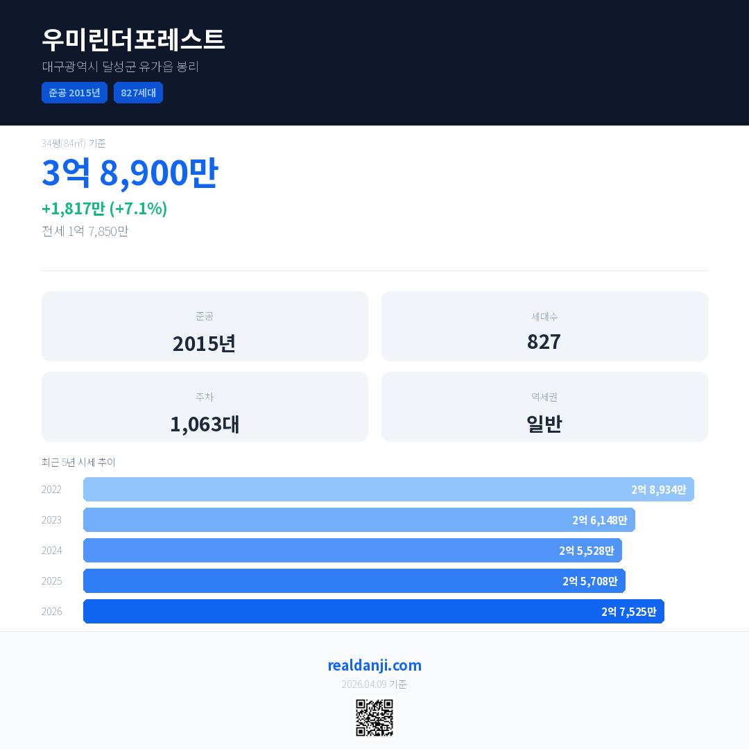 우미린더포레스트 최근 거래가는 3억 8,900만입니다. (2026-03)