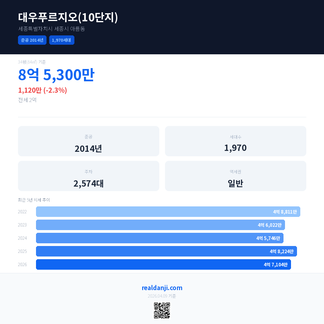 대우푸르지오(10단지) 국민평형 기준 2026년 평균 거래가는 4억 7,104만으로, 전년 대비 2.3% 하락 했습니다.