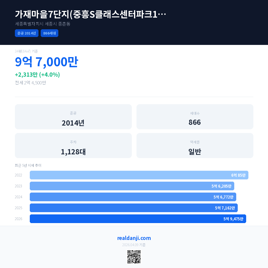 가재마을7단지(중흥S클래스센터파크1차) 국민평형 기준 2026년 평균 거래가는 5억 9,475만으로, 전년 대비 4.0% 상승 했습니다.