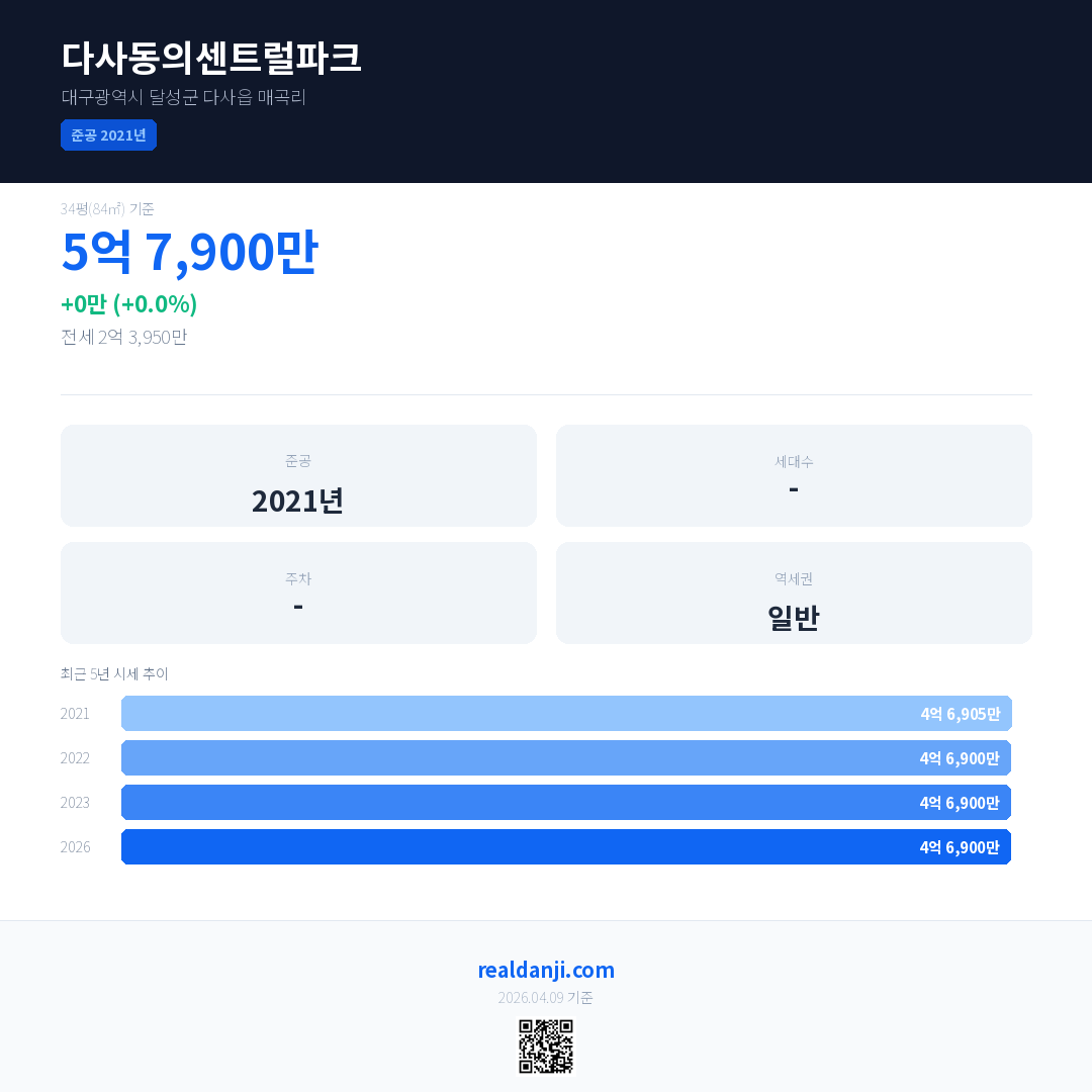 다사동의센트럴파크 국민평형 기준 2026년 평균 거래가는 4억 6,900만으로, 전년 대비 0.0% 하락 했습니다.
