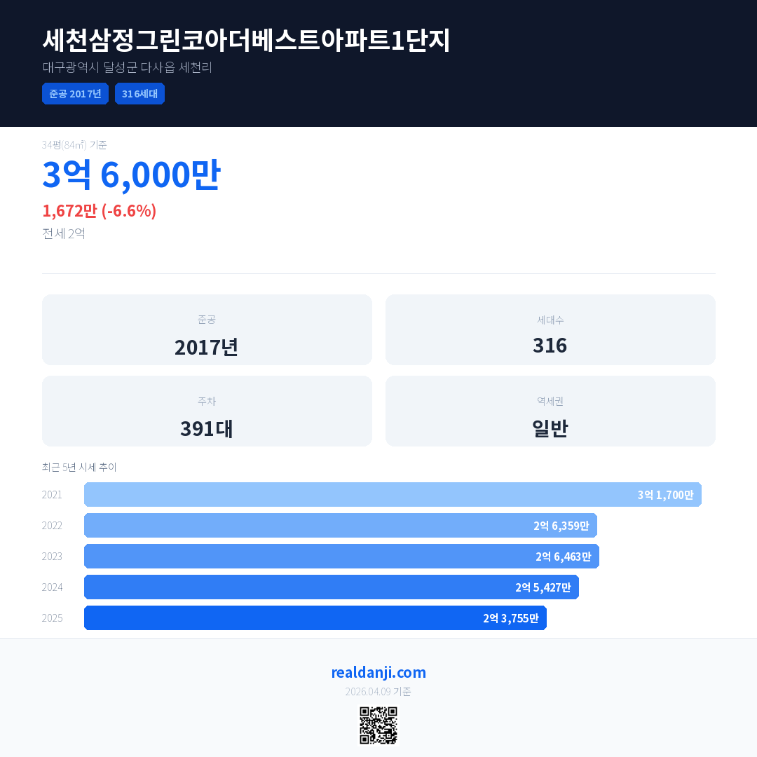 세천삼정그린코아더베스트아파트1단지 최근 거래가는 3억 6,000만입니다. (2025-12)