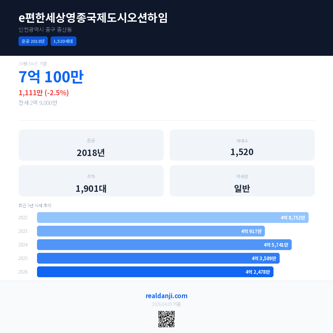 e편한세상영종국제도시오션하임은(는) 2018년에 준공되었으며, 현재 8년차입니다. 총 1,520세대 규모입니다.