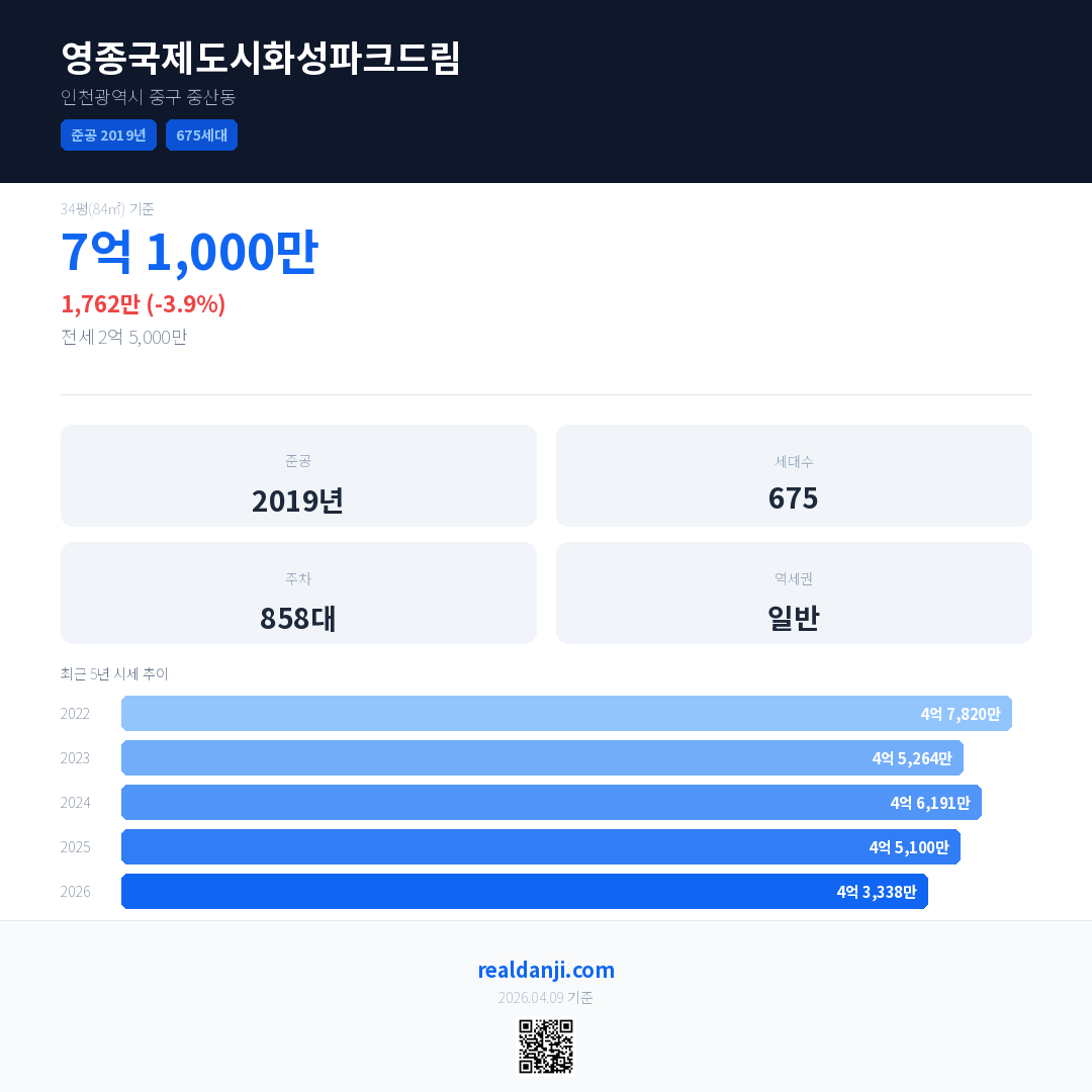 영종국제도시화성파크드림 국민평형 기준 2026년 평균 거래가는 4억 3,338만으로, 전년 대비 3.9% 하락 했습니다.