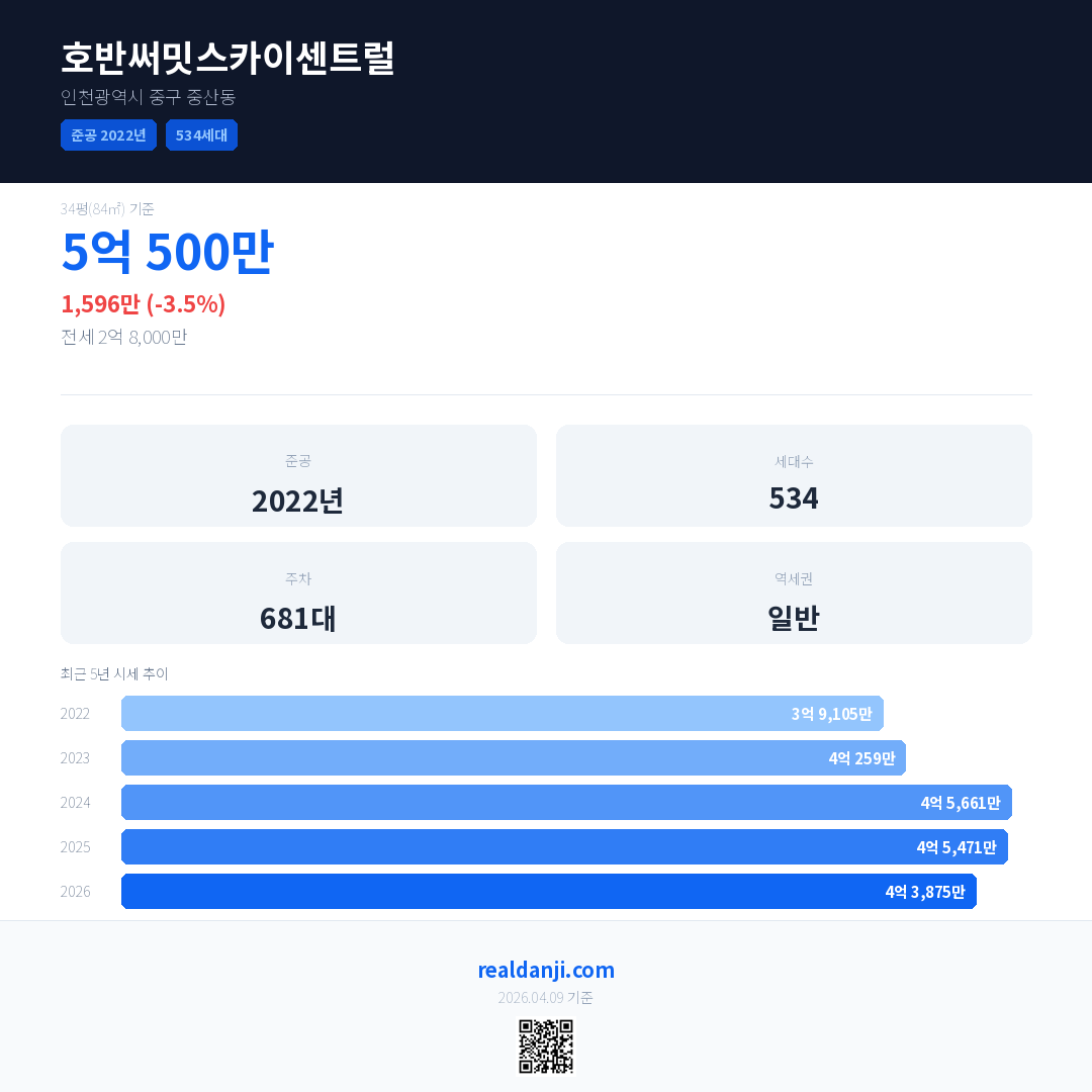 호반써밋스카이센트럴 국민평형 기준 2026년 평균 거래가는 4억 3,875만으로, 전년 대비 3.5% 하락 했습니다.