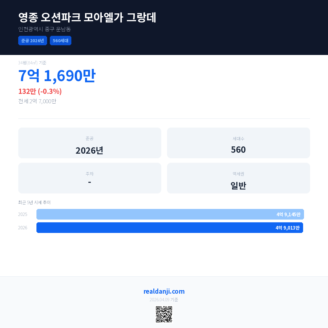 영종 오션파크 모아엘가 그랑데 국민평형 기준 2026년 평균 거래가는 4억 9,013만으로, 전년 대비 0.3% 하락 했습니다.