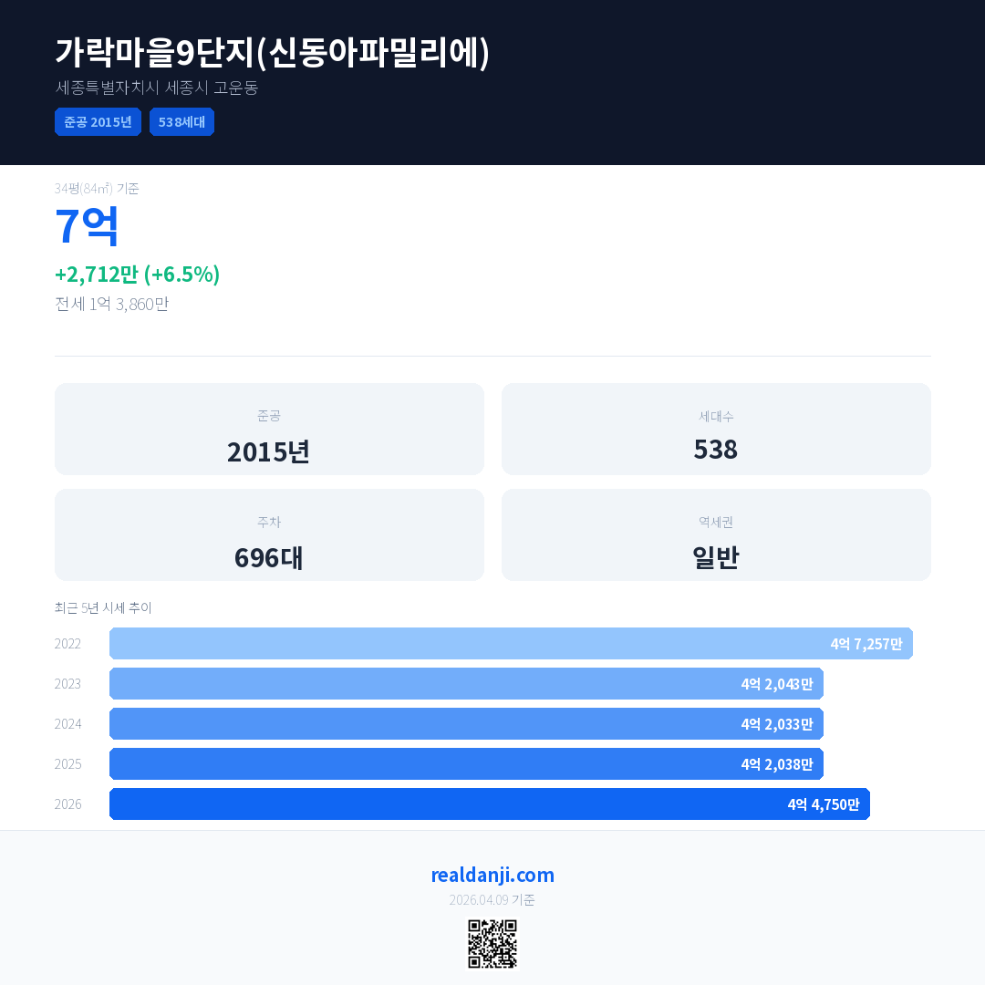 가락마을9단지(신동아파밀리에) 국민평형 기준 2026년 평균 거래가는 4억 4,750만으로, 전년 대비 6.5% 상승 했습니다.