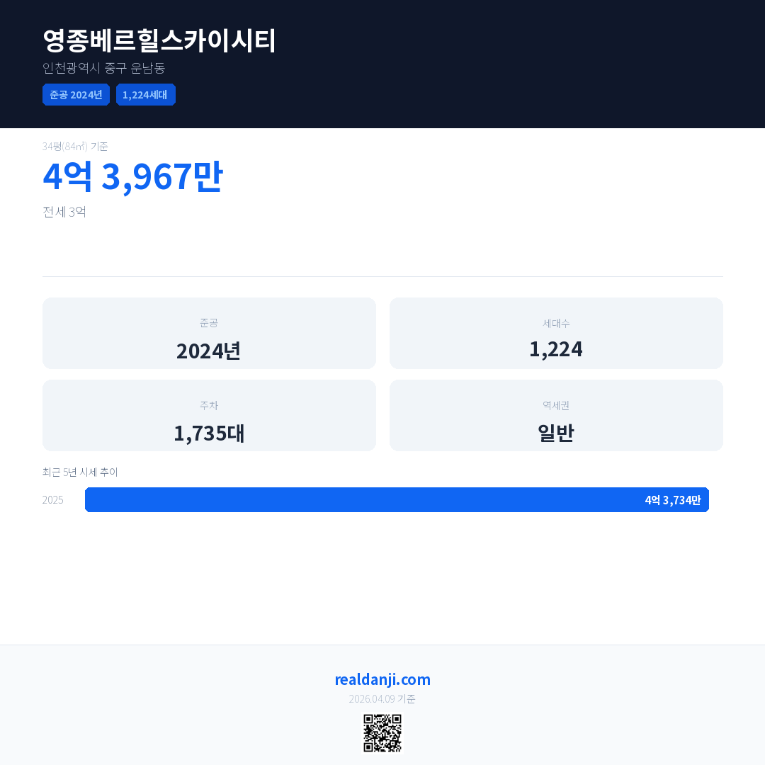 영종베르힐스카이시티은(는) 2024년에 준공되었으며, 현재 2년차입니다. 총 1,224세대 규모입니다.