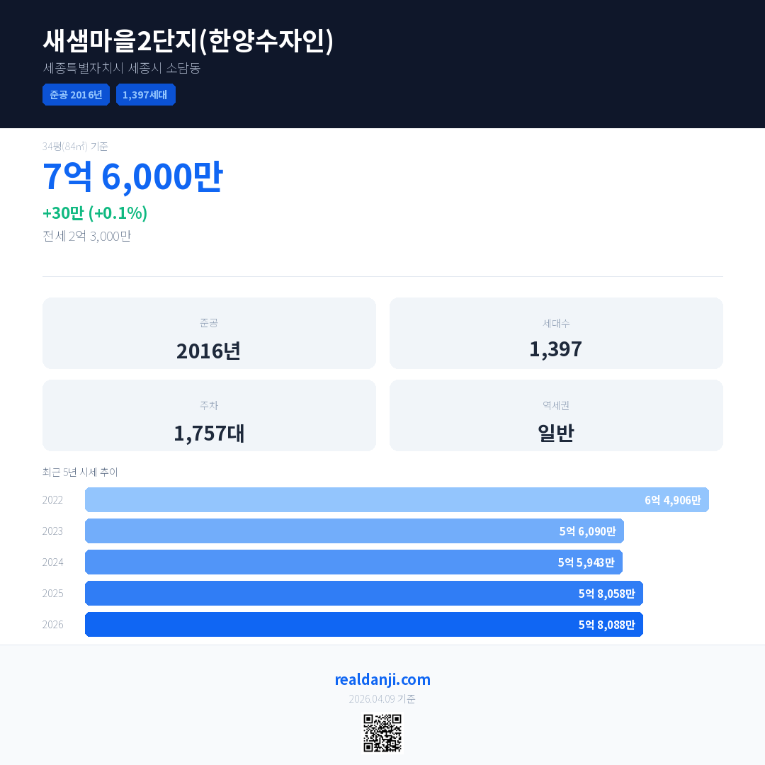 새샘마을2단지(한양수자인) 국민평형 기준 2026년 평균 거래가는 5억 8,088만으로, 전년 대비 0.1% 상승 했습니다.