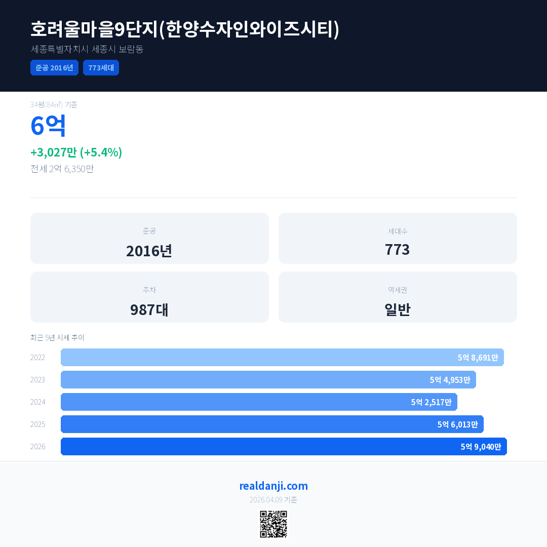 호려울마을9단지(한양수자인와이즈시티) 국민평형 기준 2026년 평균 거래가는 5억 9,500만으로, 전년 대비 6.2% 상승 했습니다.