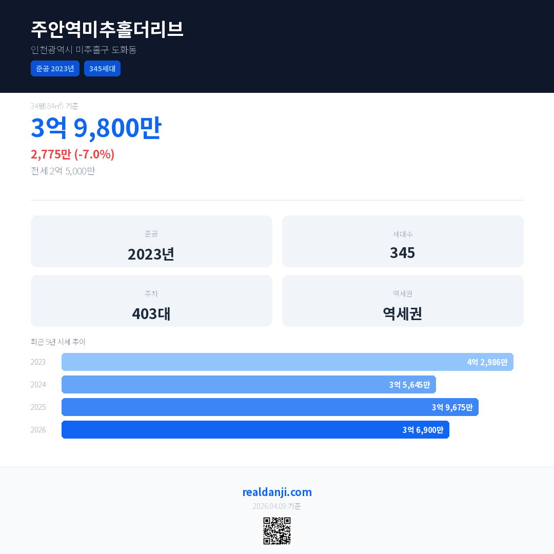 주안역미추홀더리브은(는) 2023년에 준공되었으며, 현재 3년차입니다. 총 345세대 규모입니다.
