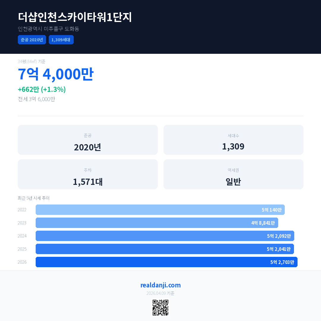더샵인천스카이타워1단지 최근 거래가는 7억 4,000만입니다. (2026-04)