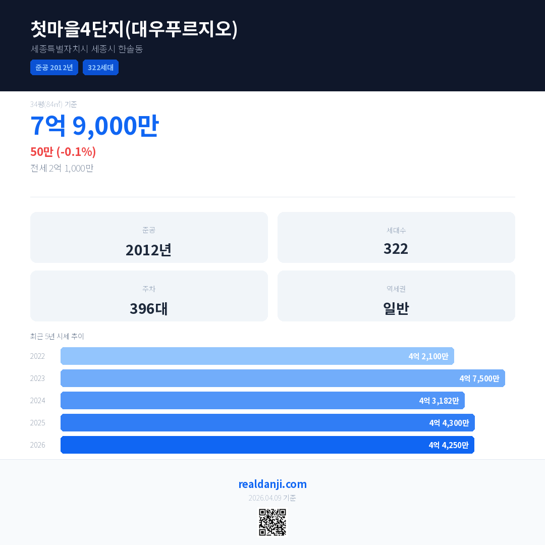 첫마을4단지(대우푸르지오) 최근 거래가는 7억 9,000만입니다. (2026-03)