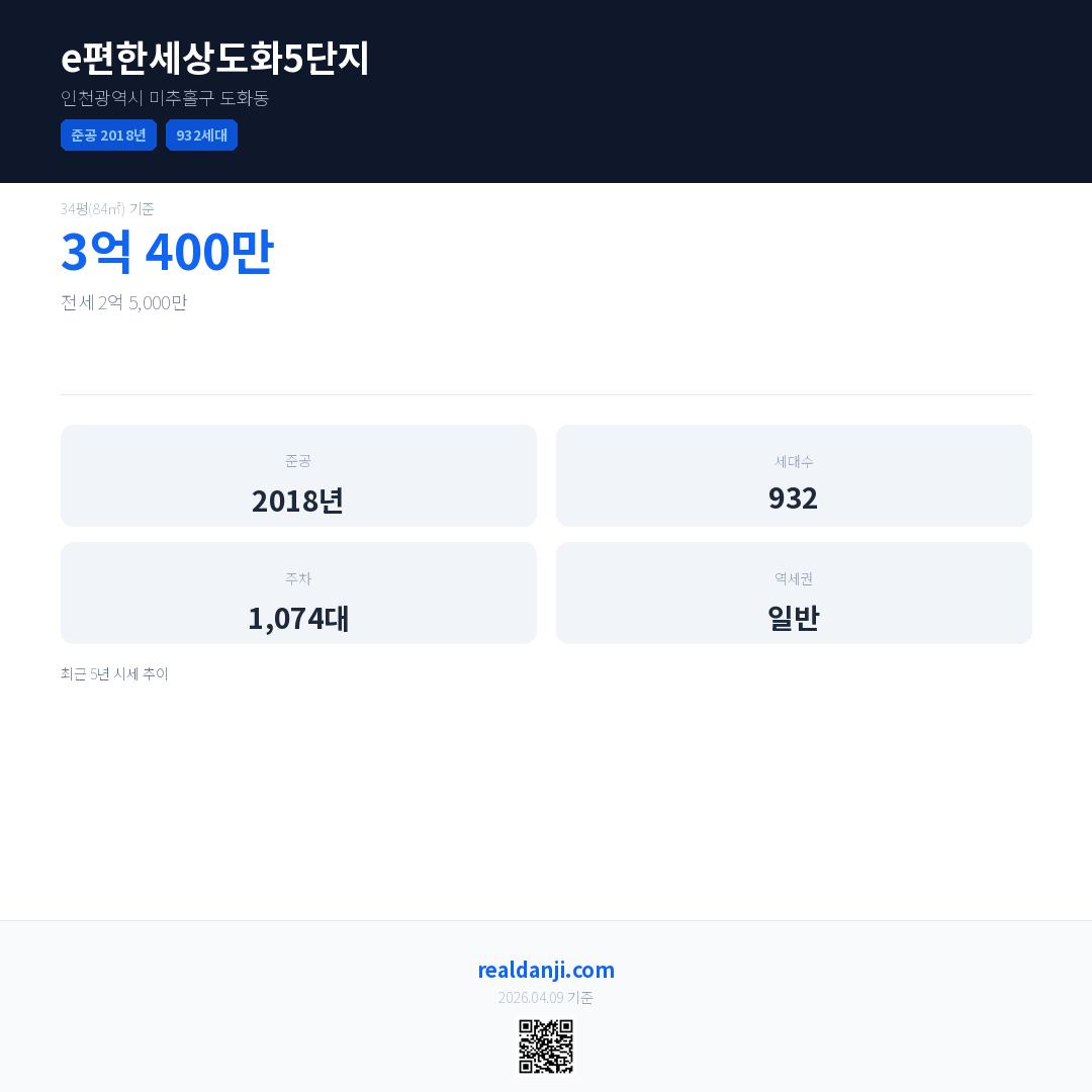 e편한세상도화5단지은(는) 2018년에 준공되었으며, 현재 8년차입니다. 총 932세대 규모입니다.