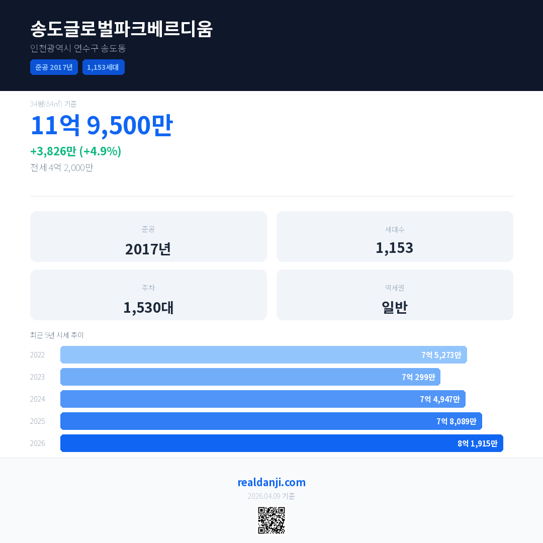 송도글로벌파크베르디움 국민평형 기준 2026년 평균 거래가는 8억 1,915만으로, 전년 대비 4.9% 상승 했습니다.