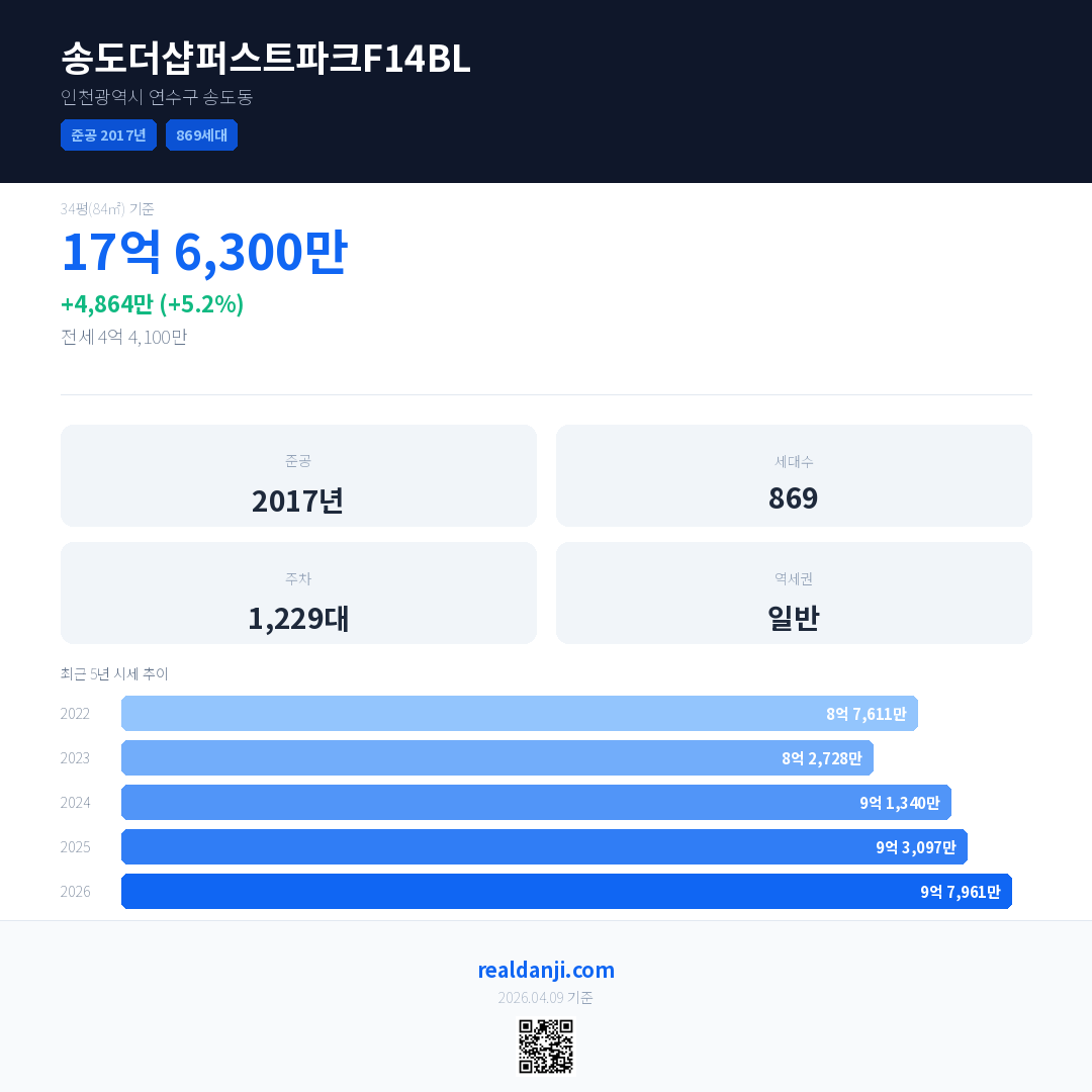 송도더샵퍼스트파크F14BL은(는) 2017년에 준공되었으며, 현재 9년차입니다. 총 869세대 규모입니다.