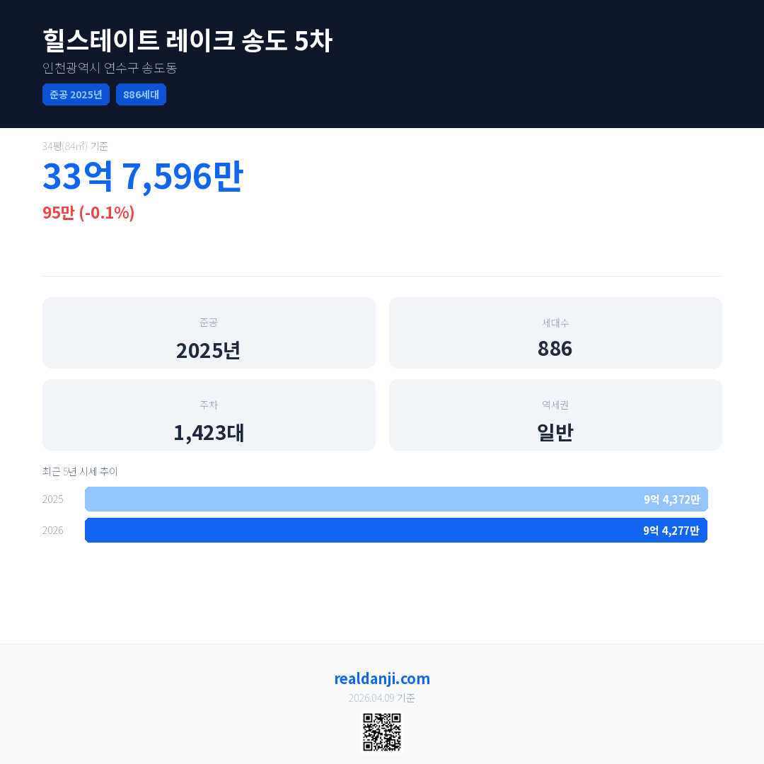 힐스테이트 레이크 송도 5차 국민평형 기준 2026년 평균 거래가는 9억 4,277만으로, 전년 대비 0.1% 하락 했습니다.