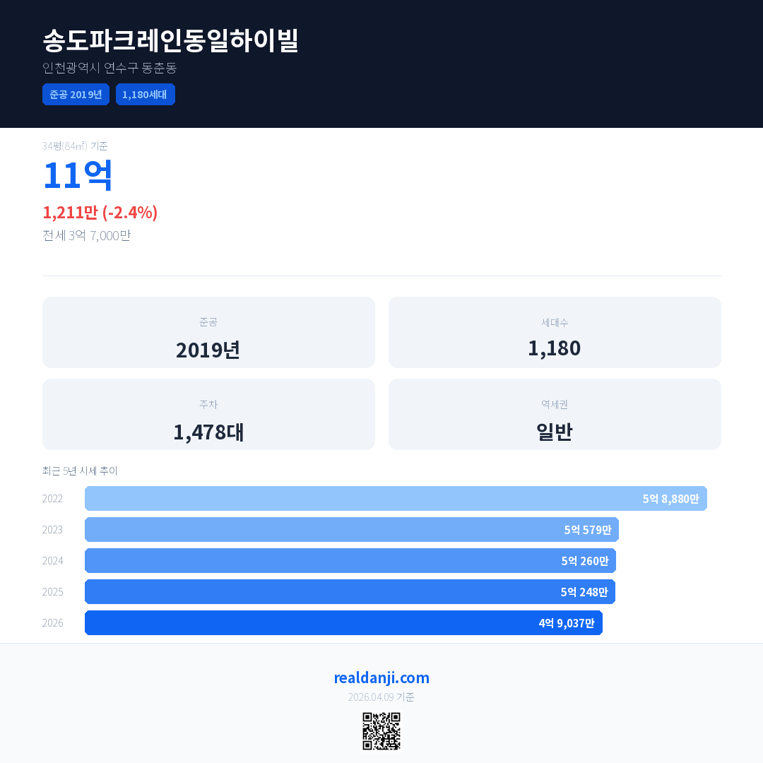 송도파크레인동일하이빌 최근 거래가는 11억입니다. (2026-03)