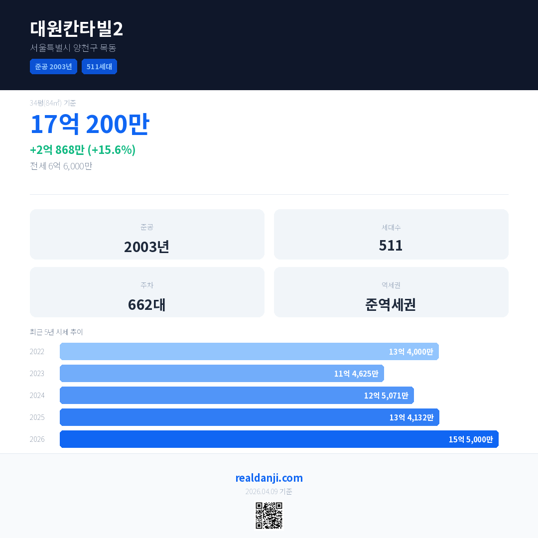 대원칸타빌2 국민평형 기준 2026년 평균 거래가는 15억 5,000만으로, 전년 대비 15.6% 상승 했습니다.