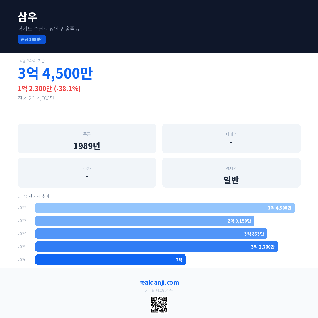 삼우 최근 거래가는 3억 4,500만입니다. (2026-04)