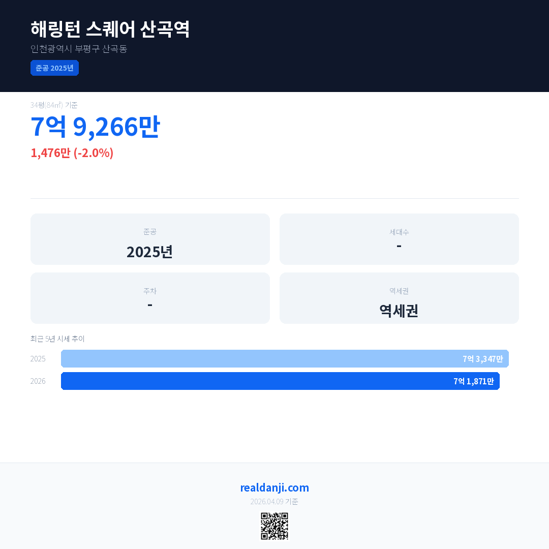 해링턴 스퀘어 산곡역 최근 거래가는 7억 9,070만입니다. (2026-04)