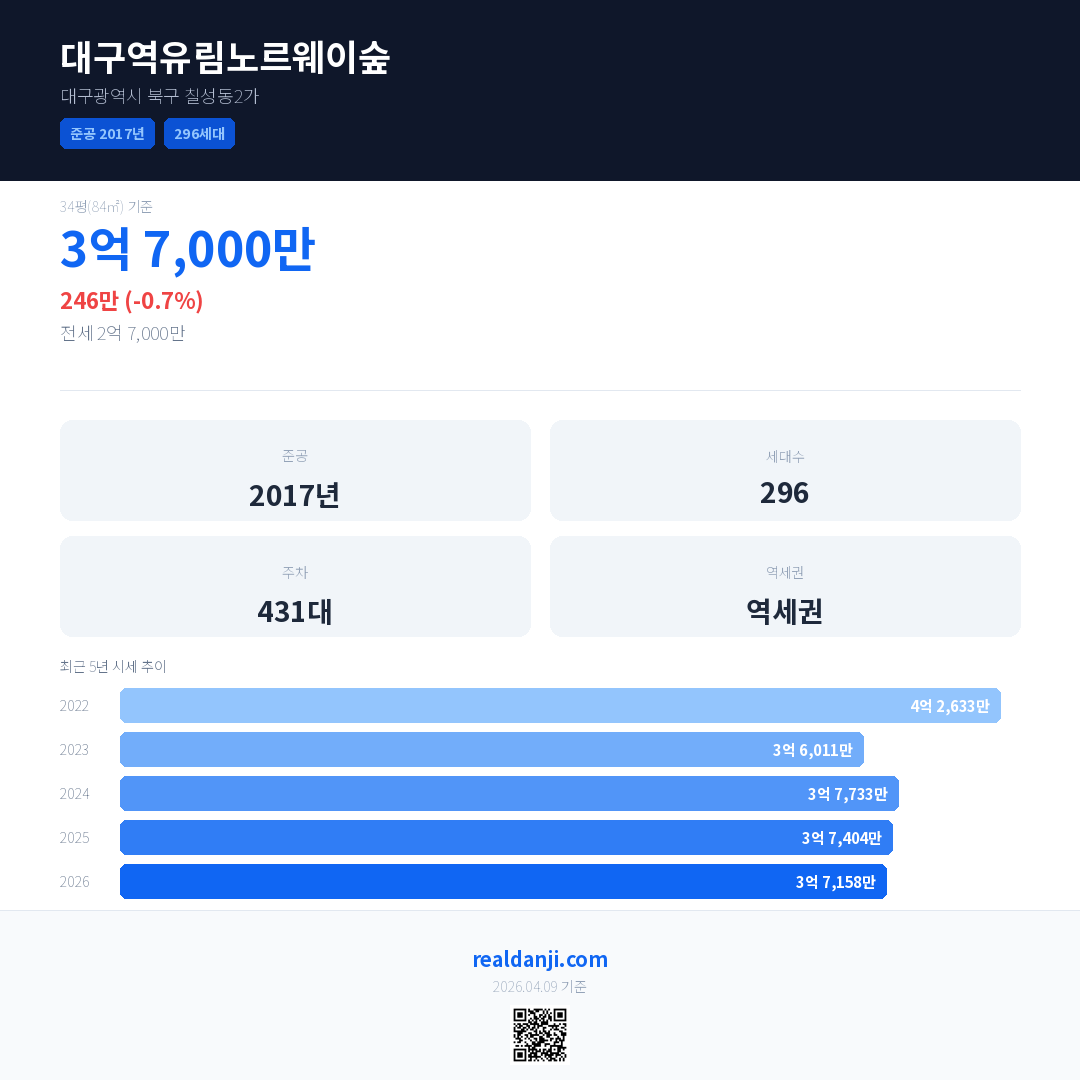 대구역유림노르웨이숲 국민평형 기준 2026년 평균 거래가는 3억 7,158만으로, 전년 대비 0.7% 하락 했습니다.