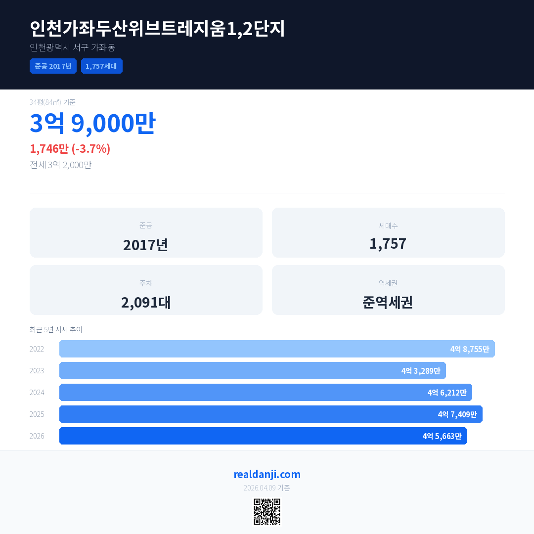 인천가좌두산위브트레지움1,2단지 국민평형 기준 2026년 평균 거래가는 4억 5,663만으로, 전년 대비 3.7% 하락 했습니다.