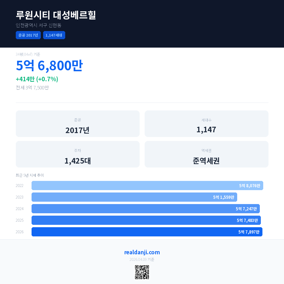 루원시티 대성베르힐 국민평형 기준 2026년 평균 거래가는 5억 7,897만으로, 전년 대비 0.7% 상승 했습니다.