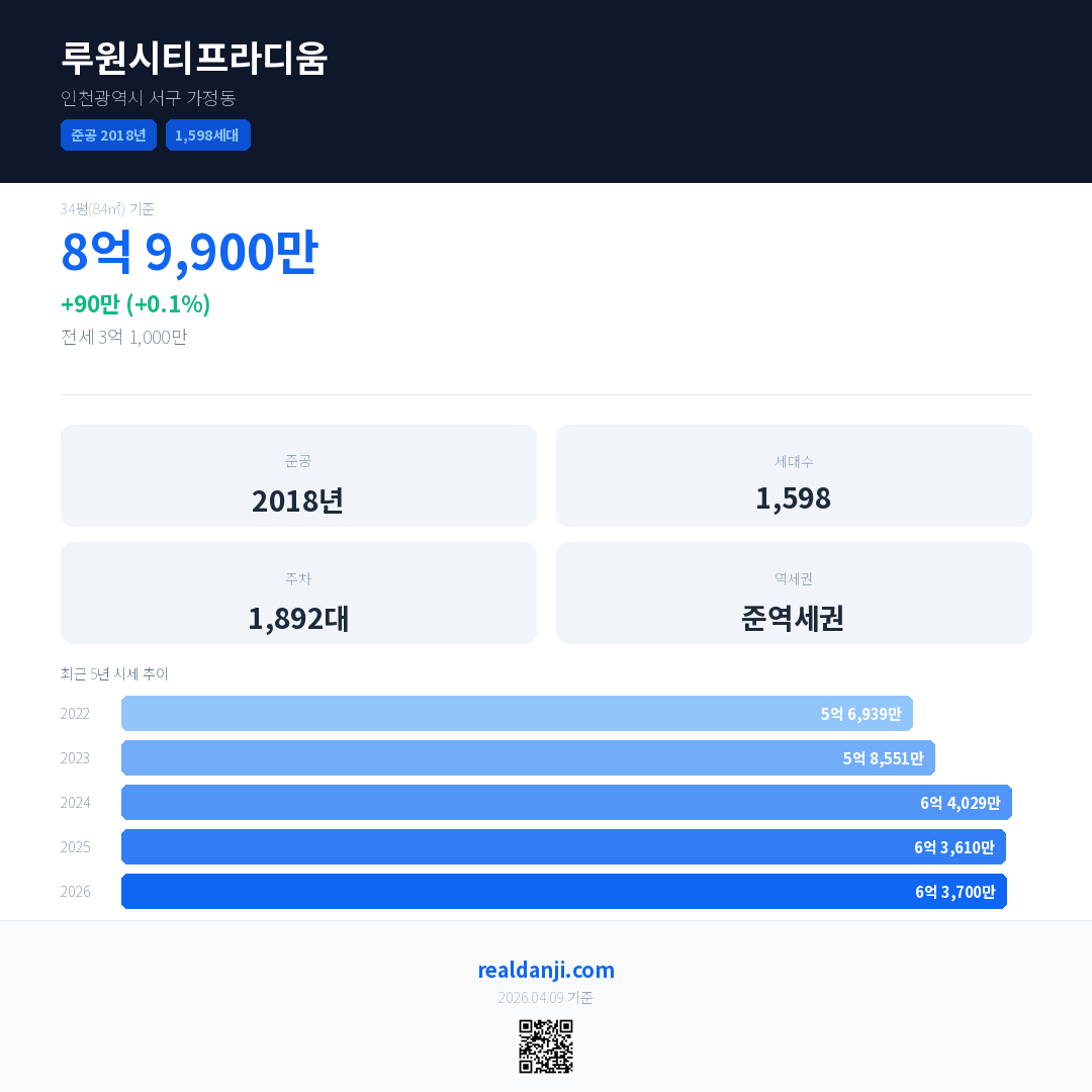 루원시티프라디움 국민평형 기준 2026년 평균 거래가는 6억 3,700만으로, 전년 대비 0.1% 상승 했습니다.