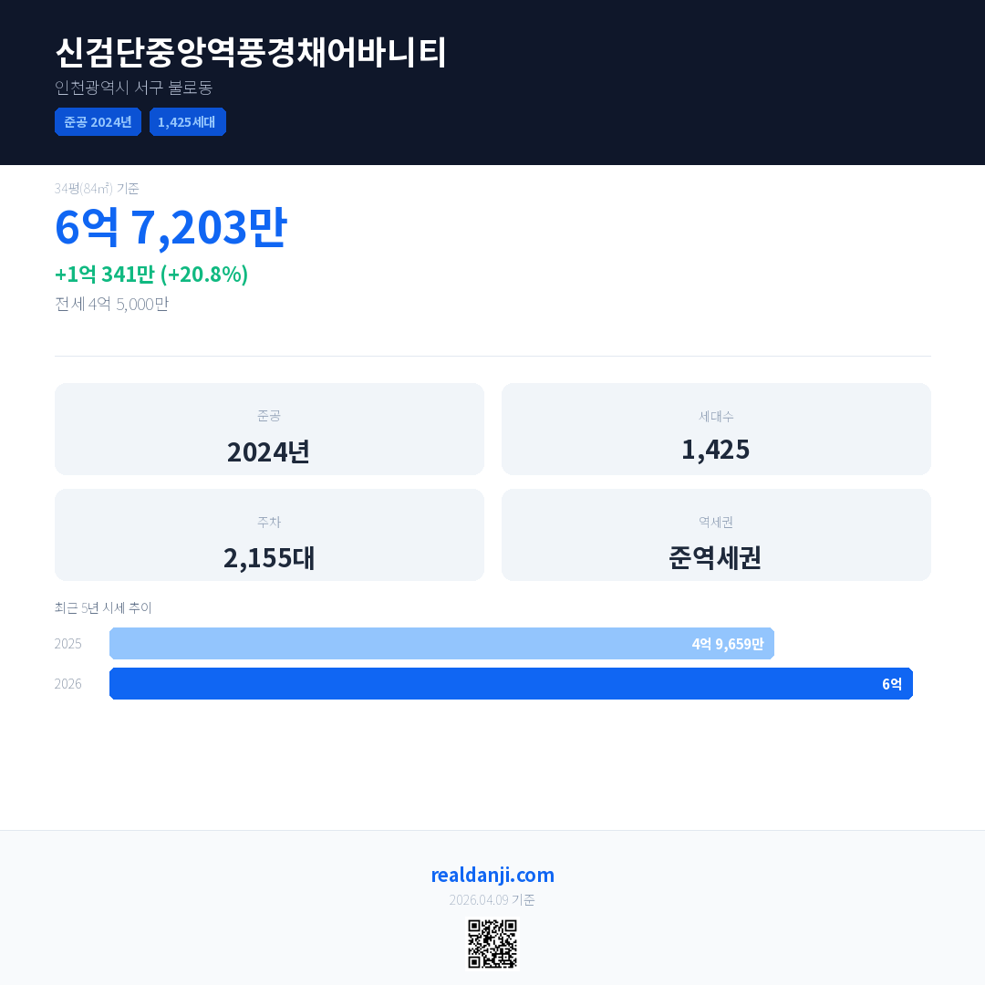 신검단중앙역풍경채어바니티 국민평형 기준 2026년 평균 거래가는 6억으로, 전년 대비 20.8% 상승 했습니다.