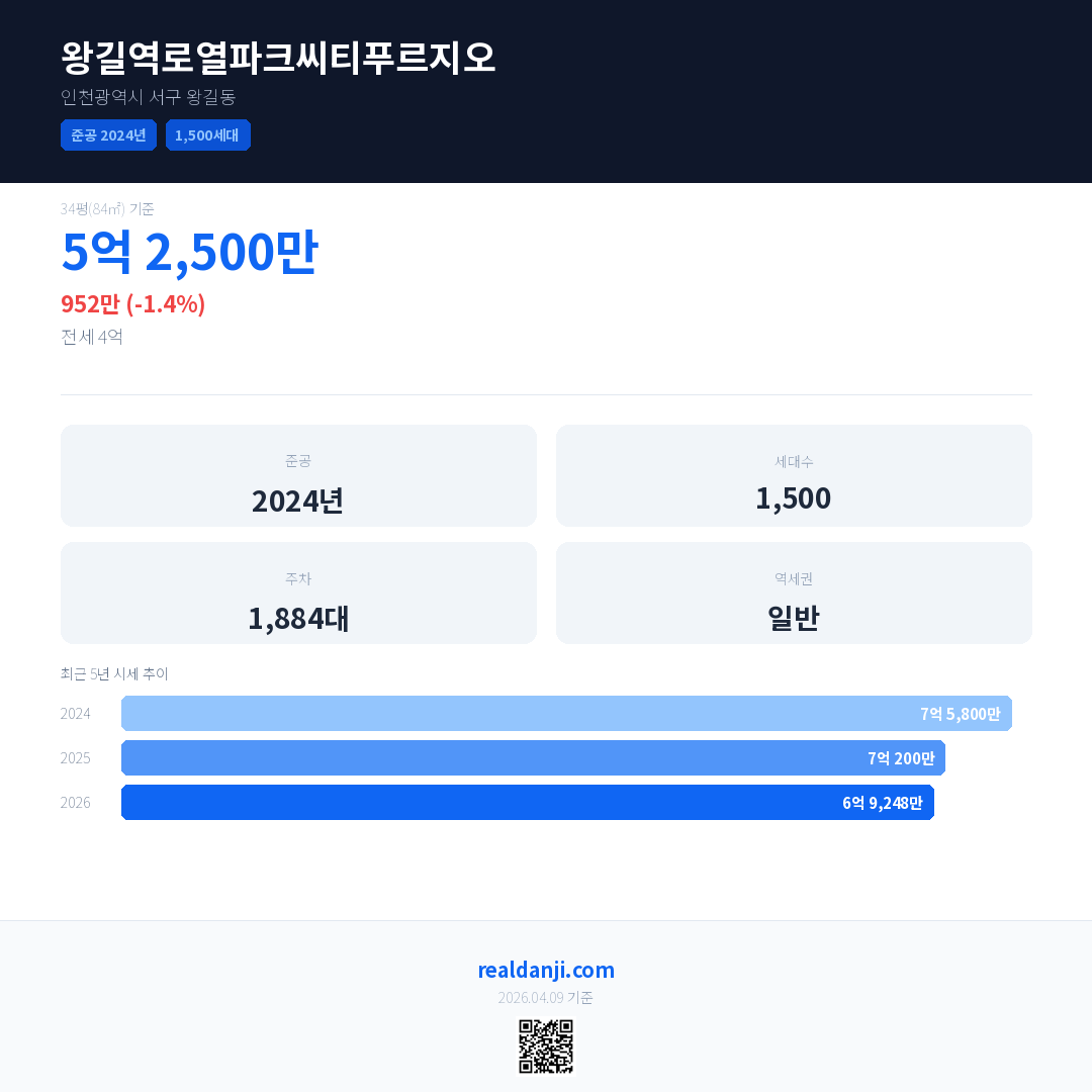 왕길역로열파크씨티푸르지오은(는) 2024년에 준공되었으며, 현재 2년차입니다. 총 1,500세대 규모입니다.
