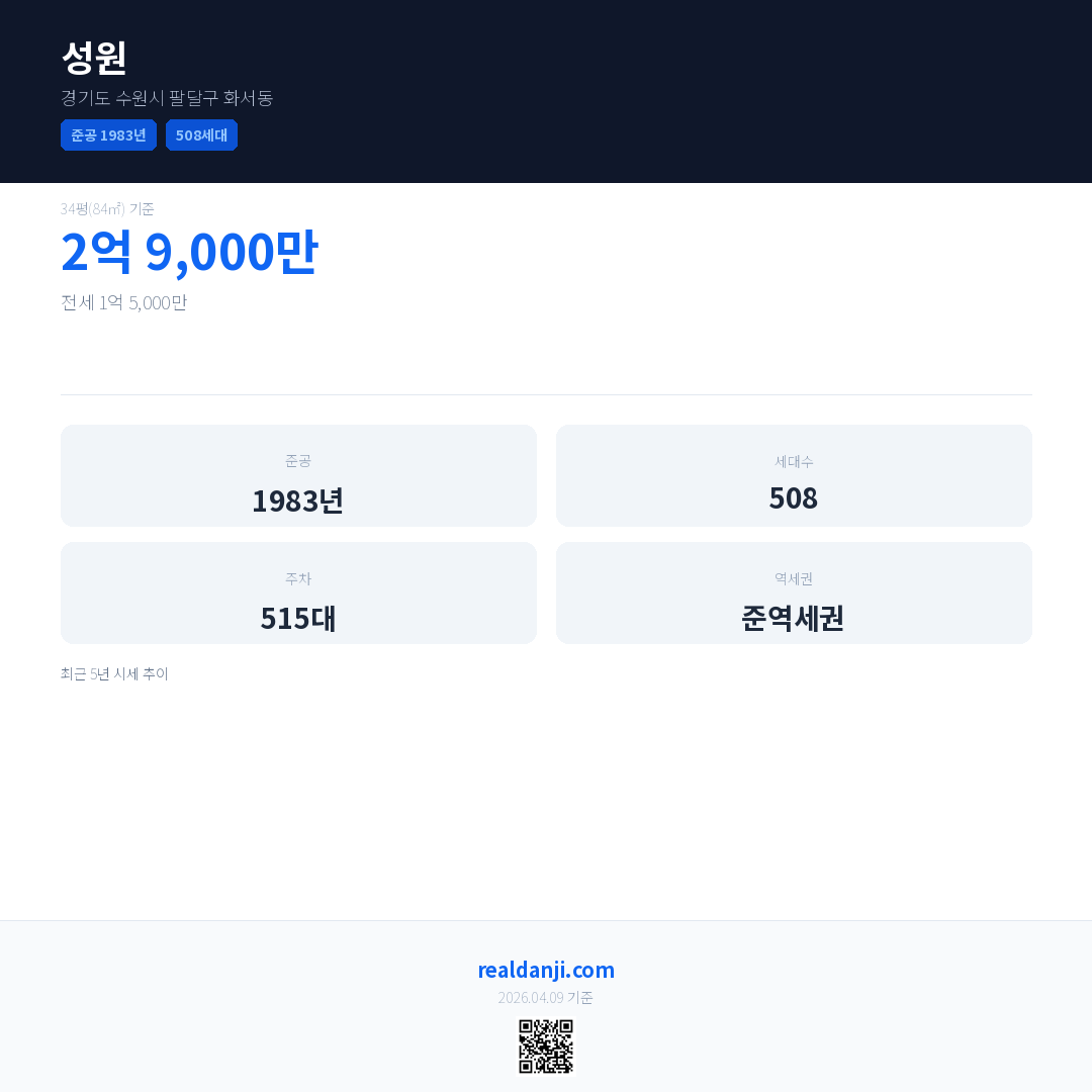 성원은(는) 1983년에 준공되었으며, 현재 43년차입니다. 총 508세대 규모입니다.