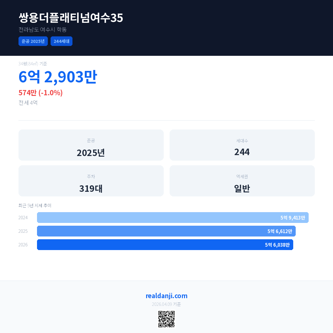 쌍용더플래티넘여수35 최근 거래가는 5억 4,900만입니다. (2026-03)