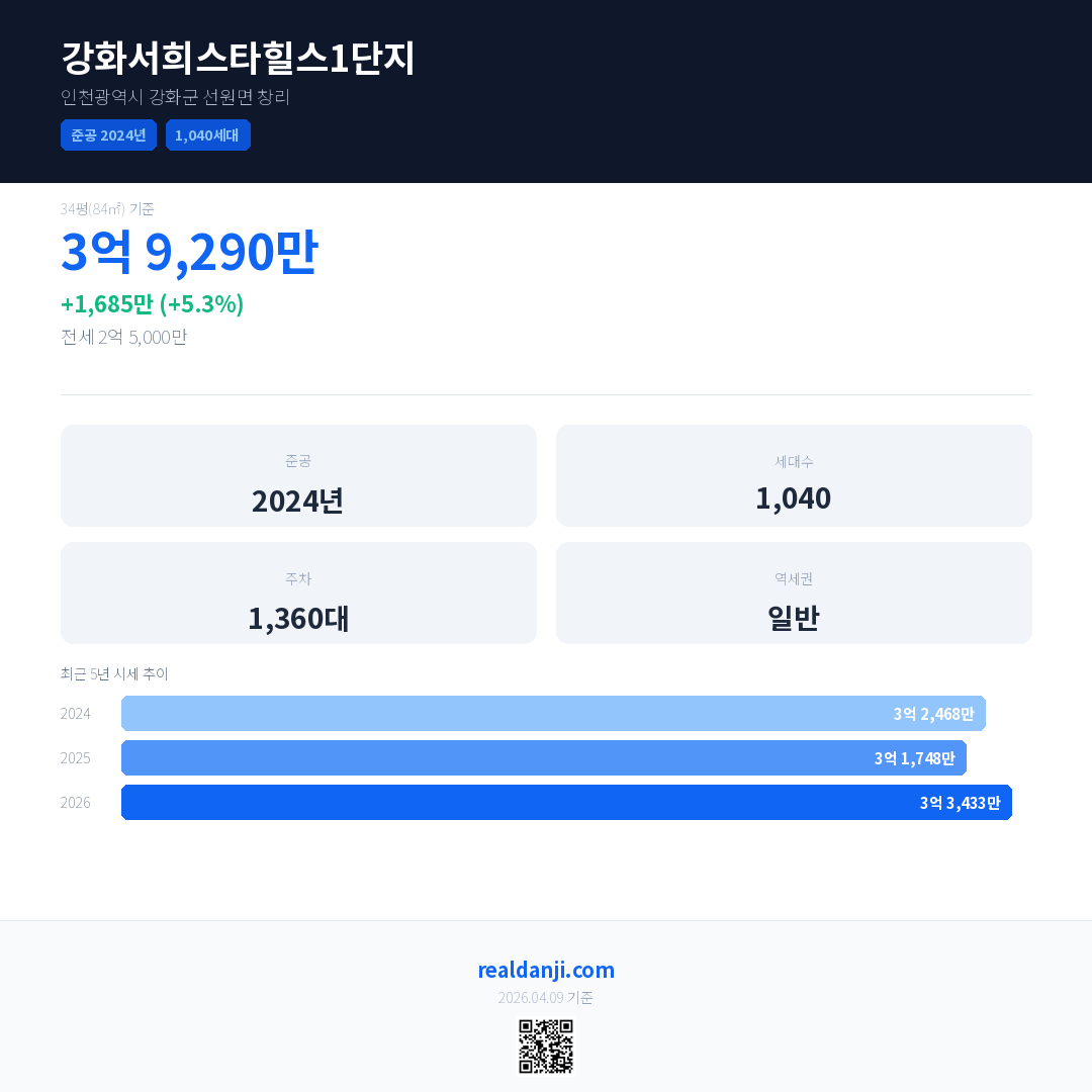 강화서희스타힐스1단지 최근 거래가는 2억 4,000만입니다. (2026-03)