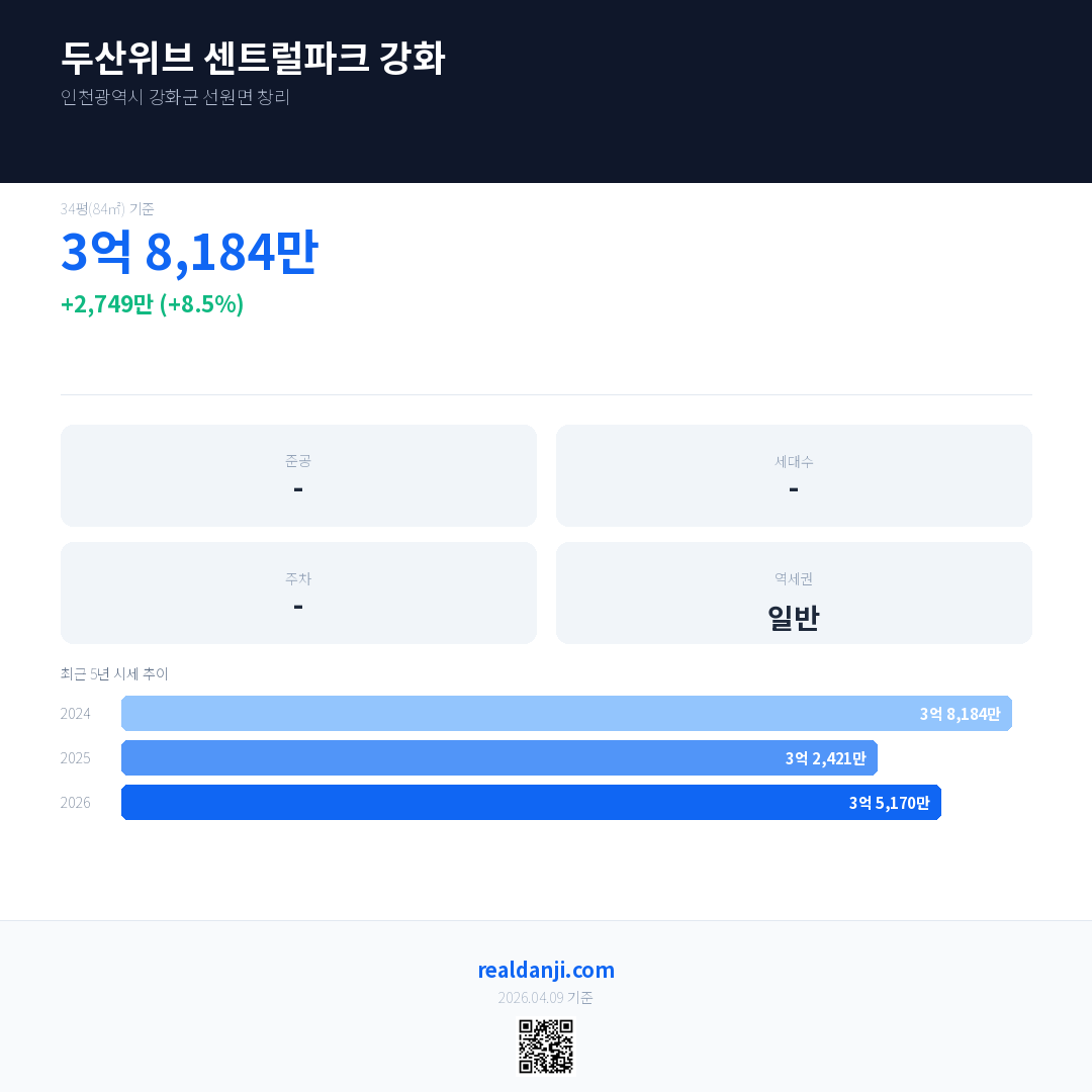 두산위브 센트럴파크 강화 최근 거래가는 3억 5,170만입니다. (2026-02)