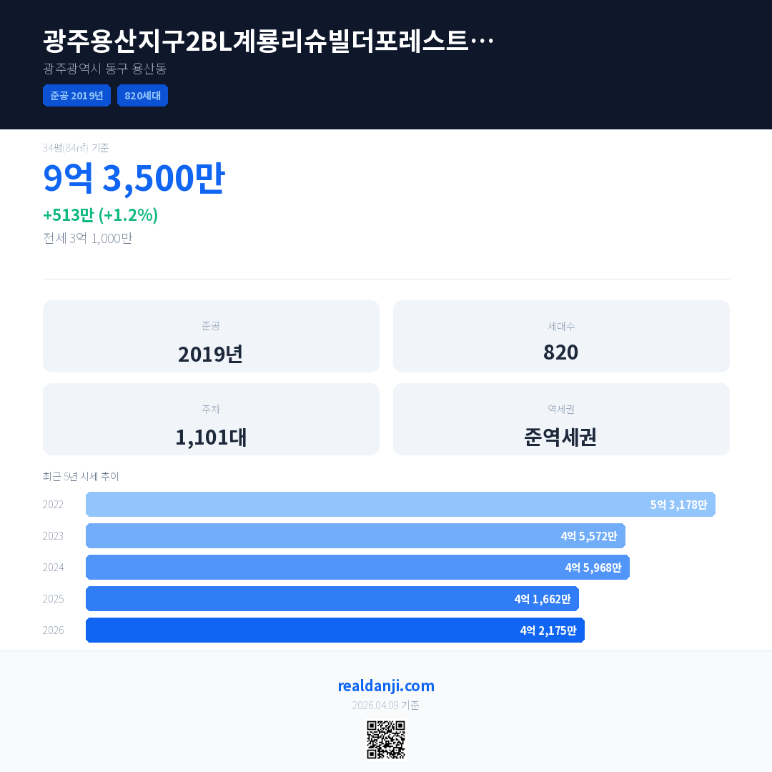 광주용산지구2BL계룡리슈빌더포레스트아파트 최근 거래가는 4억 3,500만입니다. (2026-04)
