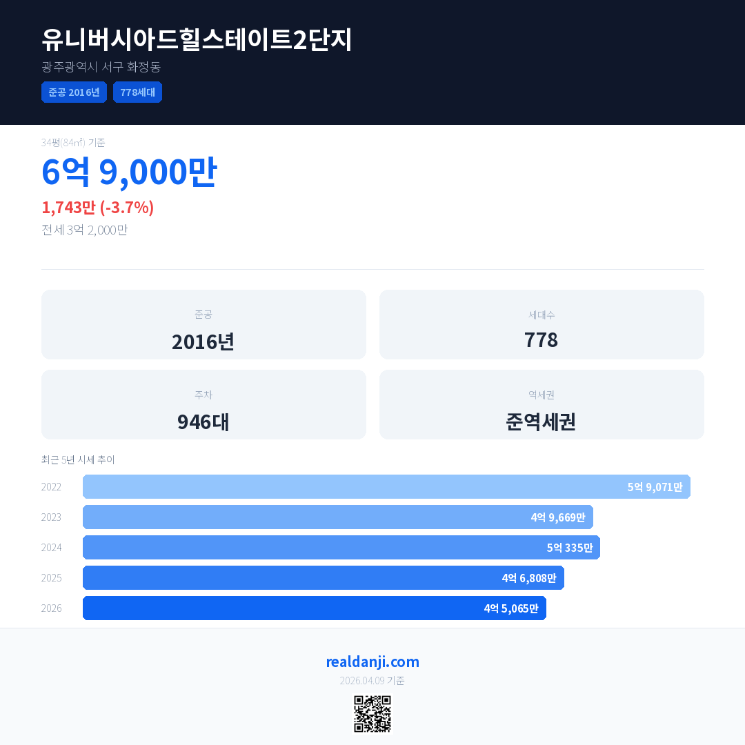 유니버시아드힐스테이트2단지은(는) 2016년에 준공되었으며, 현재 10년차입니다. 총 778세대 규모입니다.