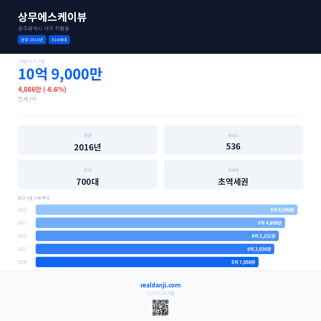 상무에스케이뷰 국민평형 기준 2026년 평균 거래가는 5억 7,950만으로, 전년 대비 6.6% 하락 했습니다.