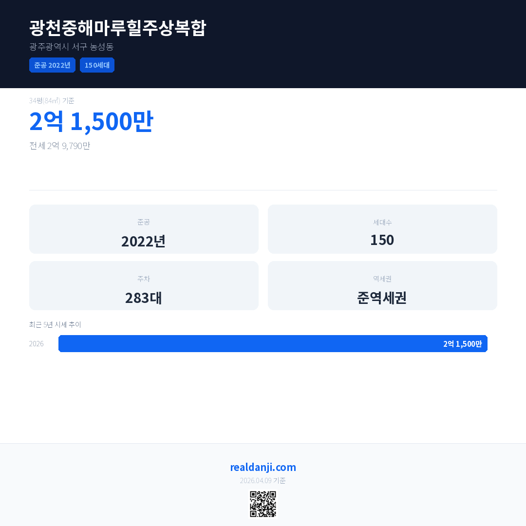 광천중해마루힐주상복합은(는) 2022년에 준공되었으며, 현재 4년차입니다. 총 150세대 규모입니다.