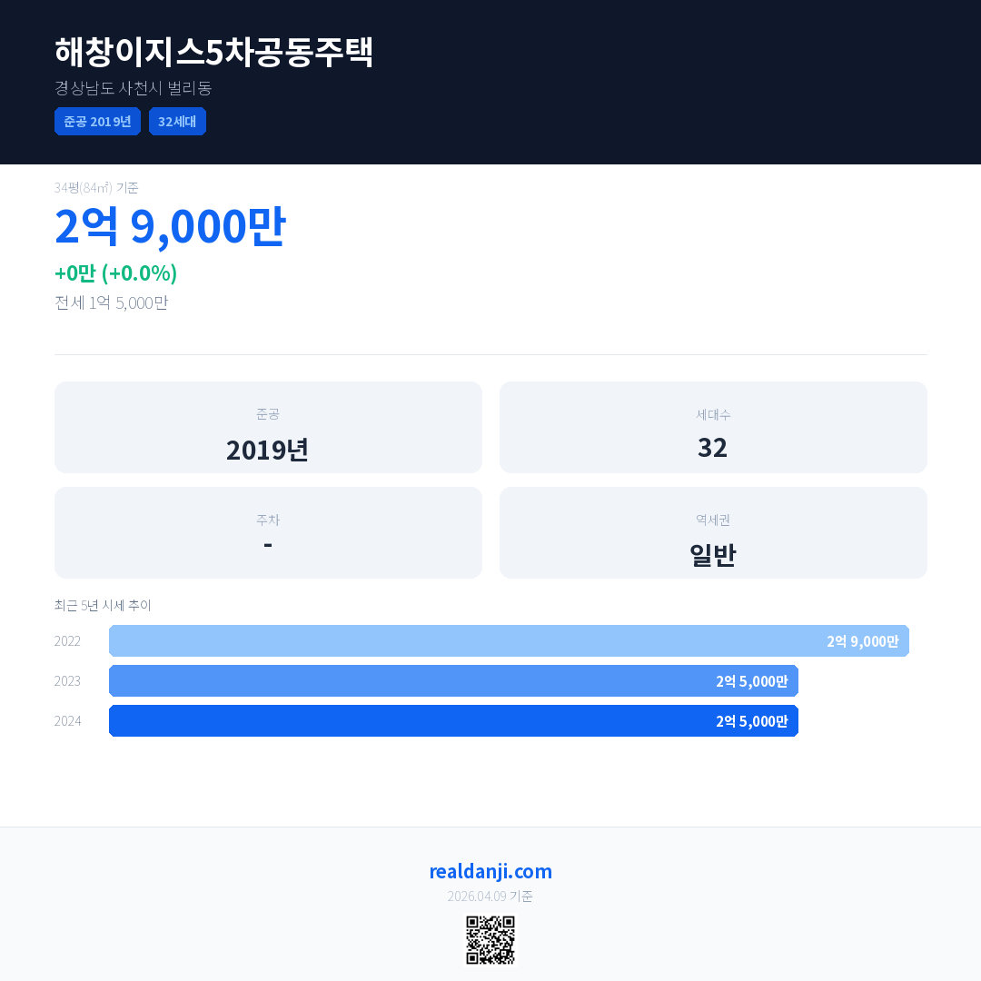 해창이지스5차공동주택 국민평형 기준 2024년 평균 거래가는 2억 5,000만으로, 전년 대비 0.0% 하락 했습니다.