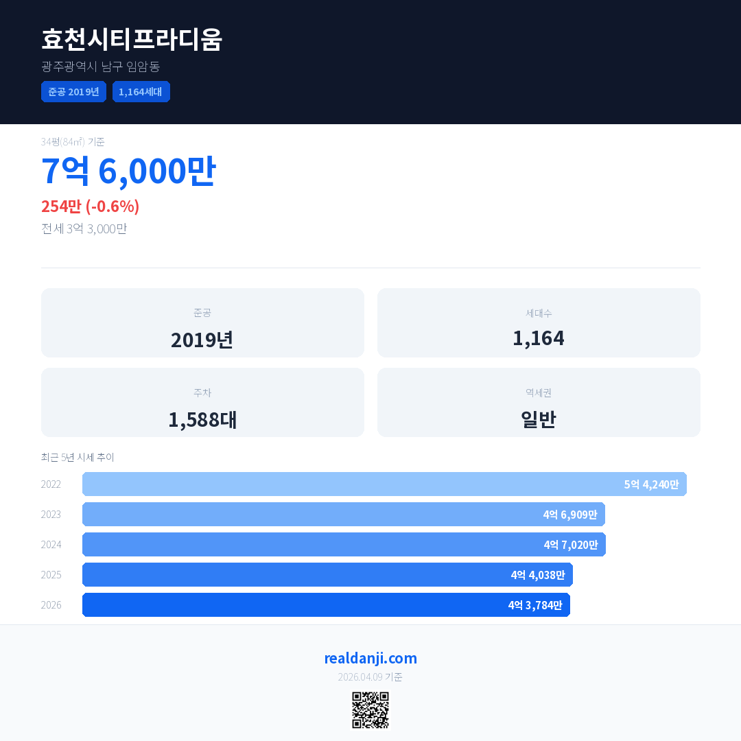 효천시티프라디움 국민평형 기준 2026년 평균 거래가는 4억 3,784만으로, 전년 대비 0.6% 하락 했습니다.
