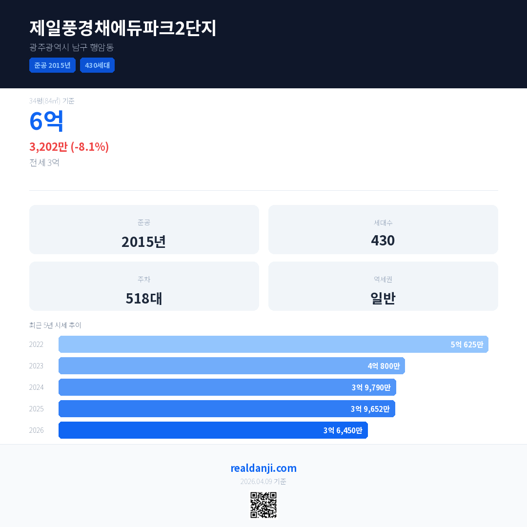 제일풍경채에듀파크2단지 최근 거래가는 6억입니다. (2026-03)