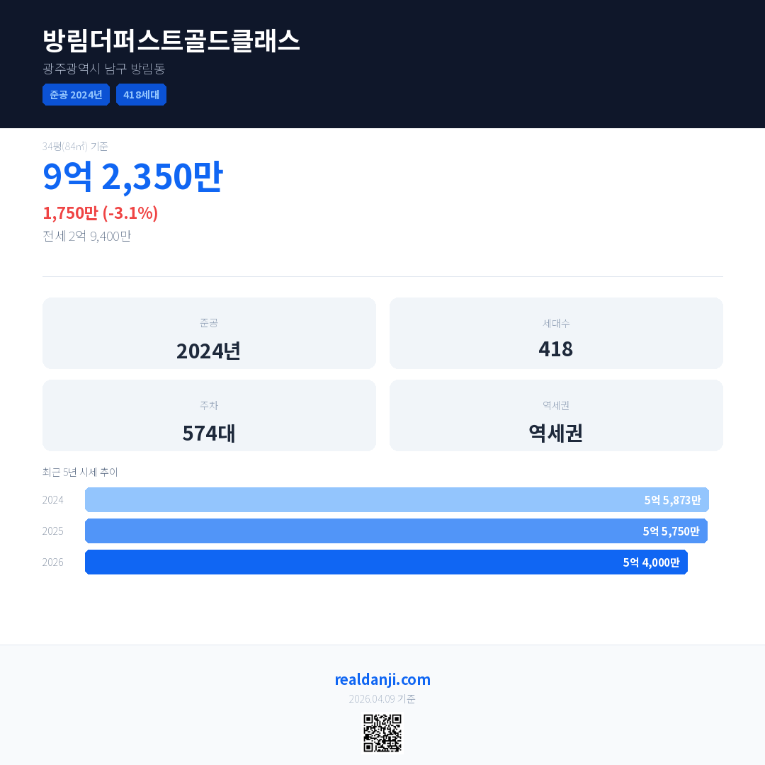 방림더퍼스트골드클래스은(는) 2024년에 준공되었으며, 현재 2년차입니다. 총 418세대 규모입니다.