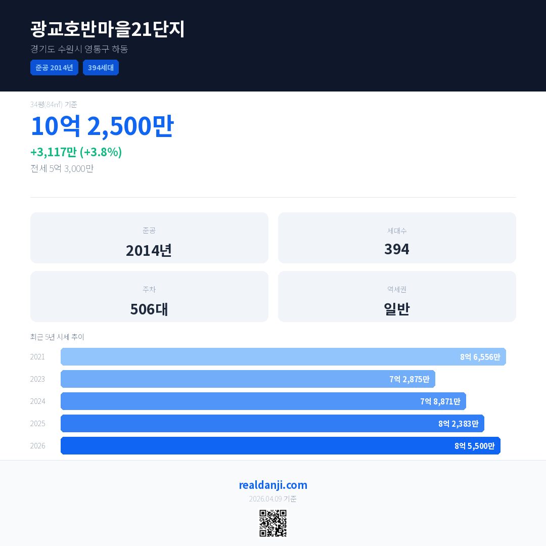 광교호반마을21단지 국민평형 기준 2026년 평균 거래가는 8억 5,500만으로, 전년 대비 3.8% 상승 했습니다.
