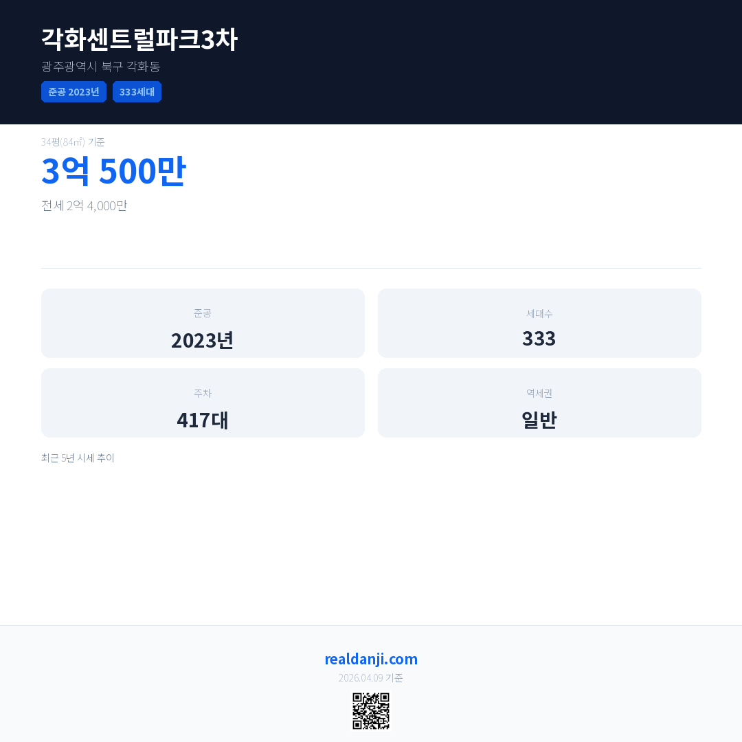 각화센트럴파크3차은(는) 2023년에 준공되었으며, 현재 3년차입니다. 총 333세대 규모입니다.