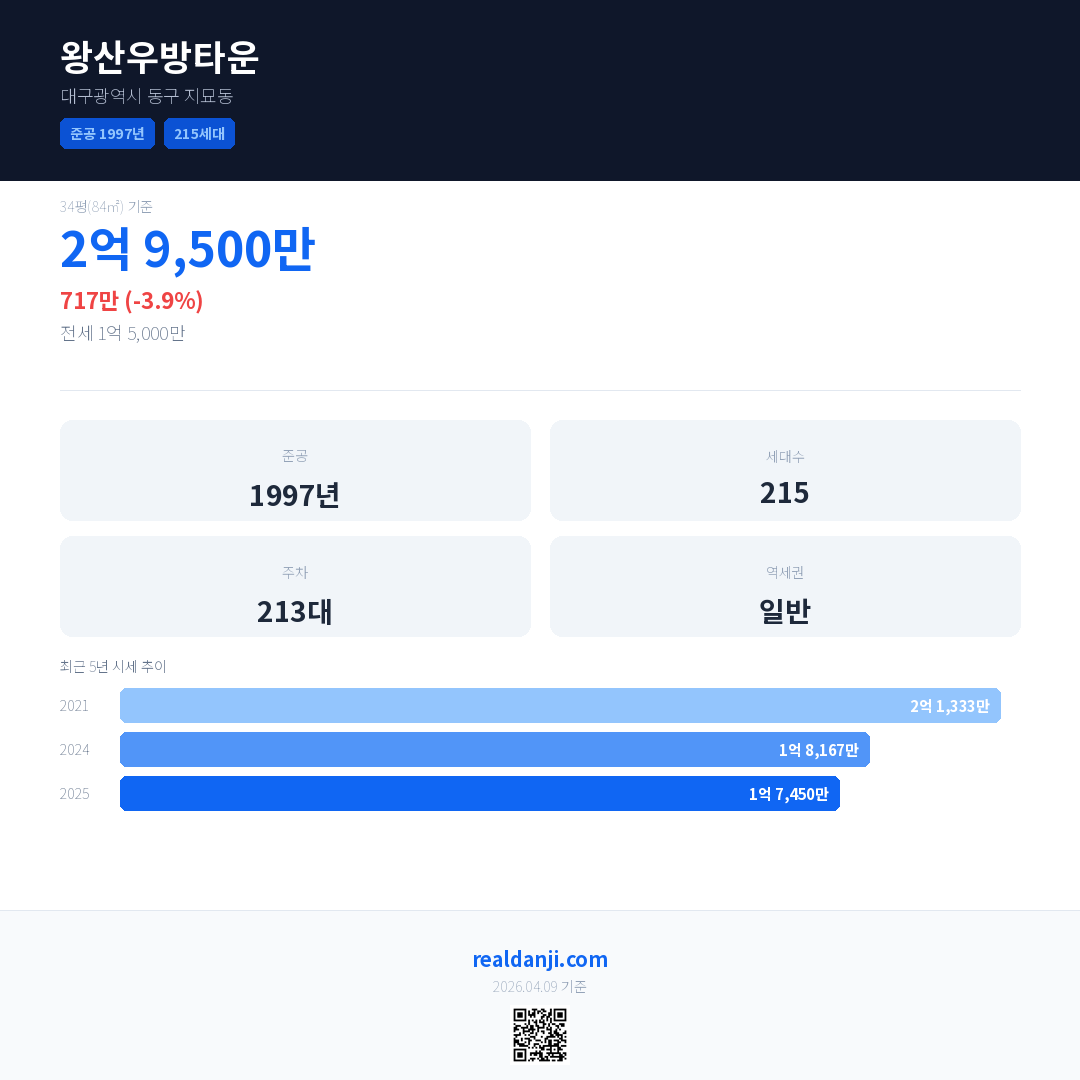 왕산우방타운 최근 거래가는 2억 9,500만입니다. (2025-11)