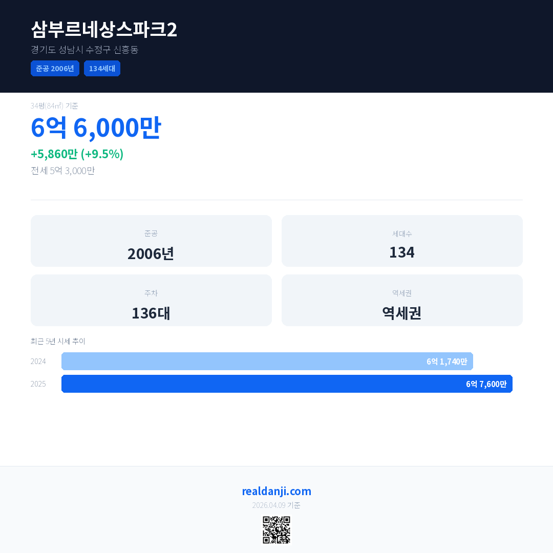삼부르네상스파크2은(는) 2006년에 준공되었으며, 현재 20년차입니다. 총 134세대 규모입니다.