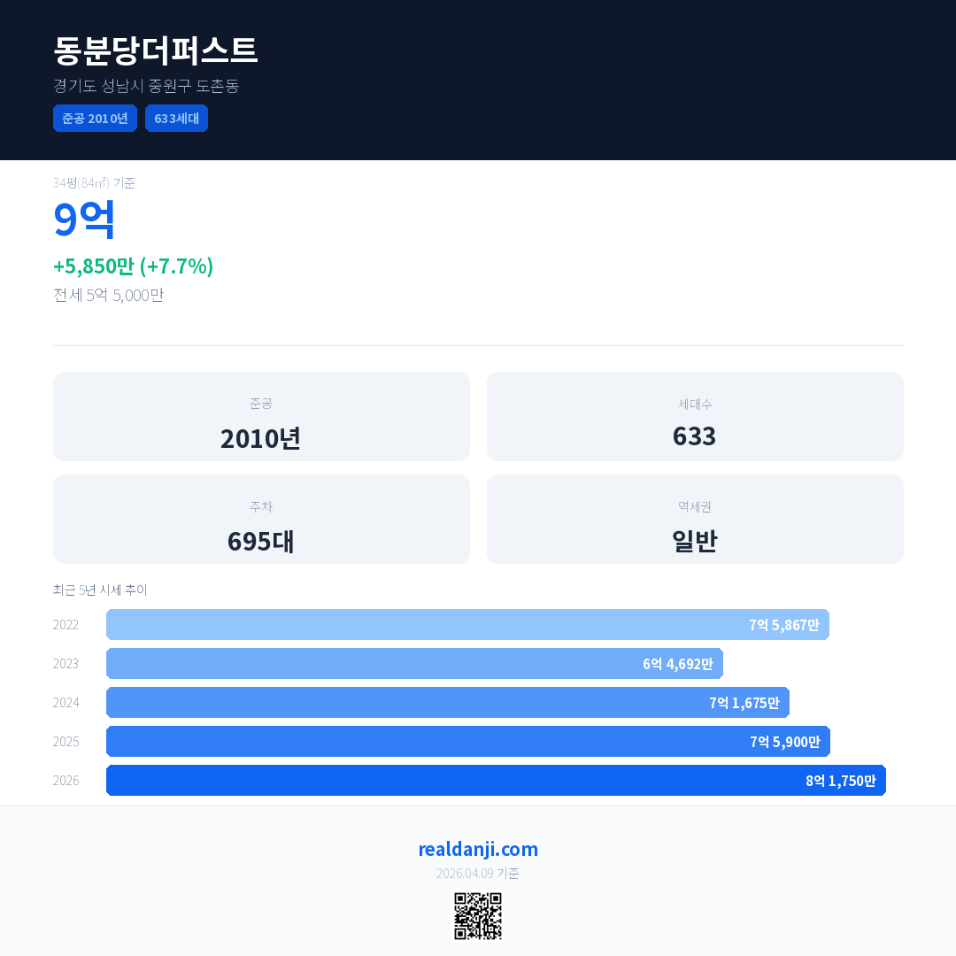 동분당더퍼스트 최근 거래가는 9억입니다. (2026-03)
