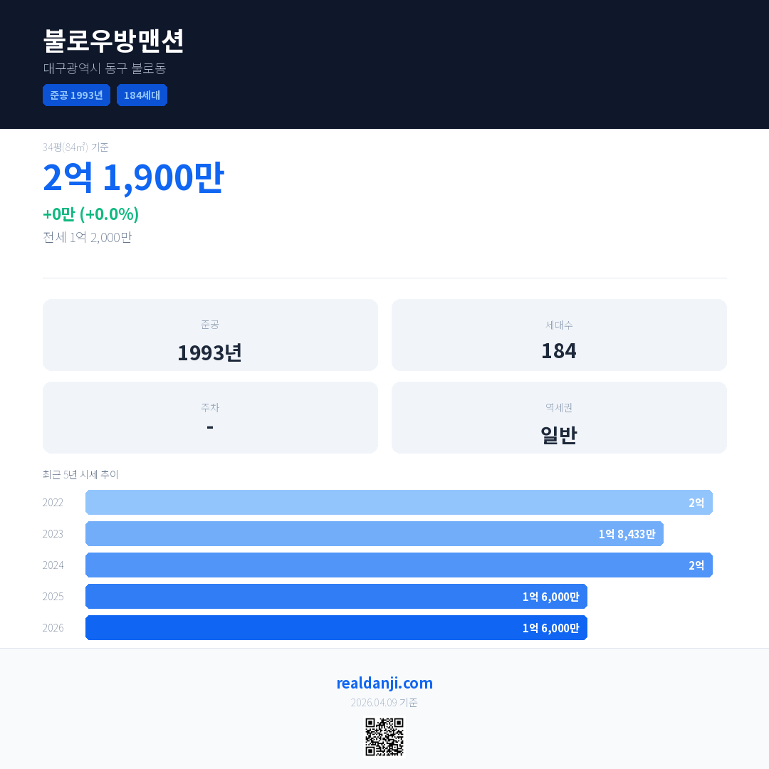 불로우방맨션 국민평형 기준 2026년 평균 거래가는 1억 6,000만으로, 전년 대비 0.0% 하락 했습니다.